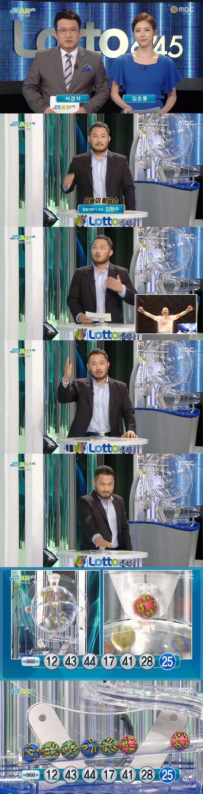 20일 방송된 MBC '생방송 행복드림 로또 6/45'에서는 제868회 로또복권 당첨번호 추첨이 진행됐다. 이날 방송에는 난치병을 이겨내고 격투기가 된 종합격투기 선수 김형수가 황금손으로 출연해 복권 추첨 버튼을 눌렀다.