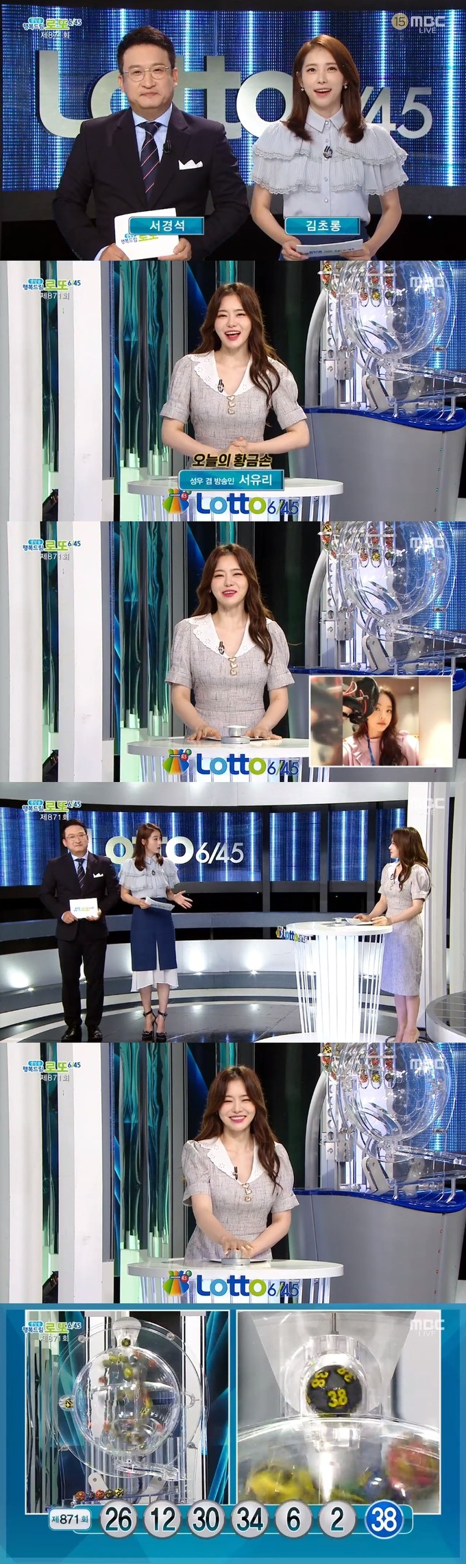 10일 방송된 MBC '생방송 행복드림 로또 6/45'에서는 제871회 로또복권 당첨번호 추첨이 진행됐다. 이날 방송에는 성우 겸 방송인 서유리가 출연해 복권 추첨 버튼을 눌렀다.