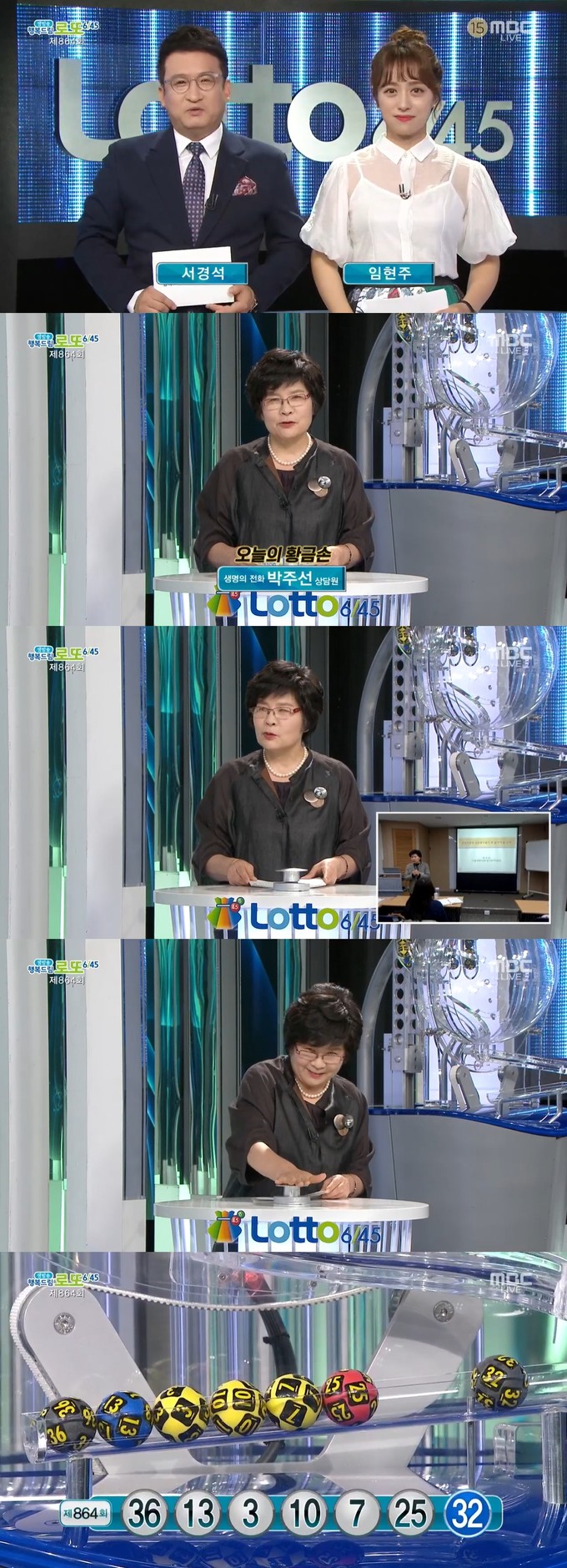 22일 방송된 MBC '생방송 행복드림 로또 6/45'에서는 제864회 로또복권 당첨번호 추첨이 진행됐다. 이날 방송에는 생명의 전화에서 40년 동안 전화 상담 봉사자로 일해온 박주선 상담원이 출연해 복권 추첨 버튼을 눌렀다.