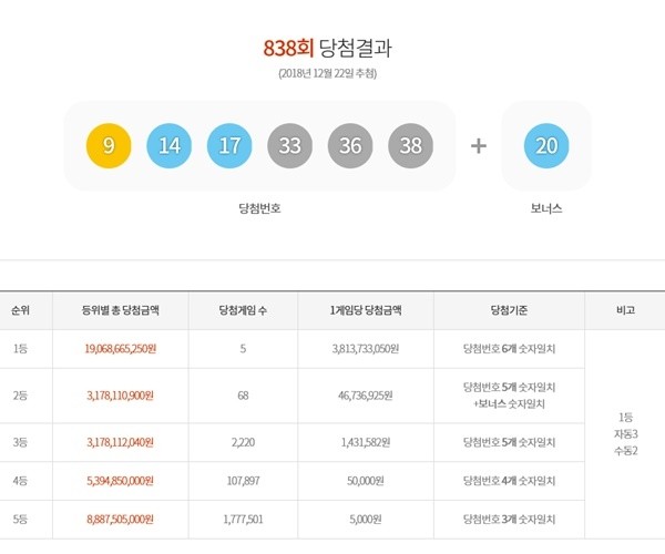 제838회 로또복권 1등 당첨번호는 '9, 14, 17, 33, 36, 38'이다. 2등 보너스 번호는 '20'이다.