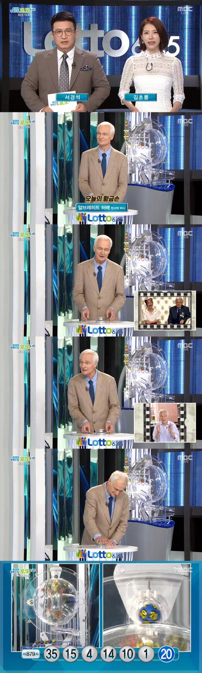 5일 방송된 MBC '생방송 행복드림 로또 6/45'에서는 제879회 로또복권 당첨번호 추첨이 진행됐다. 이날 방송에는 독일인 한국학 박사 알브레히트 허배가 출연해 복권 추첨 버튼을 눌렀다.