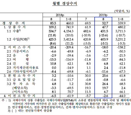 한국은행이 8일 발표한 국제수지 잠정치에 따르면 올해 8월 경상수지 흑자 규모는 52억7000만 달러로 지난해 8월(85억5000만 달러)보다 32억 8000만 달러(38.4%) 줄었다.