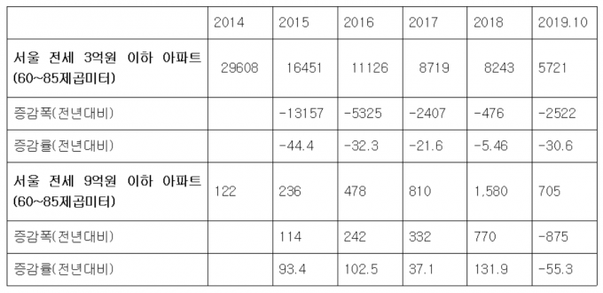 12일 국회 국토교통위원회 소속 박홍근 의원실이 2014년 이후 실거래 데이터를 분석한 결과 지난해 서울 중소형 아파트(60~85㎡) 중 전세가 3억 원 이하로 거래된 가구수는 8243가구로 집계됐다. 2014년 2만9608가구 대비 4분의 1 이상 감소한 수준이다.