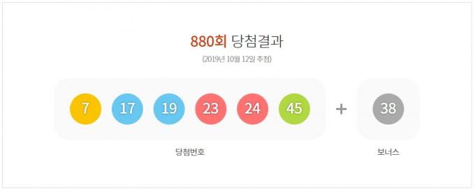 지난 12일 로또 수탁업체 동행복권은 복권통합포털을 통해 제880회 로또복권 당첨번호를 공개했다. 이날 발표된 1등 당첨번호는 7, 17, 19, 23, 24, 45며 2등 보너스번호는 38이다.