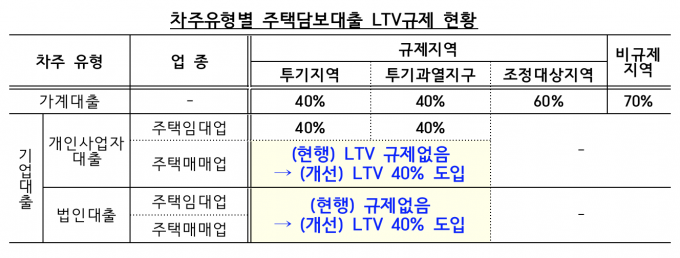 금융위원회와 금융감독원은 14일 부동산 시장 보완 방안 중 금융 부문 후속 조치로 주택임대 개인사업자의 주택담보대출에만 적용하던 LTV 40% 규제를 이날부터 투기지역·투기과열지구의 주택매매·임대업자 모두에게 적용하는 행정지도를 시행한다고 밝혔다.