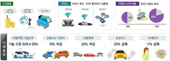 자율주행 서비스 확산을 위해선 △ 자율셔틀 △ 자율택시 △ 화물차 군집주행 등 민간 주도 3대 서비스와 △ 자율주행 무인순찰 △ 도로 긴급복구 서비스 등 공공수요 기반 9대 서비스를 우선 도입한다. '플라잉카'(도로 주행과 비행이 모두 가능한 차)는 현재 기술개발과 법제도 정비를 통해 실증과 시범사업이 가능한 단계로 2025년 실용화가 추진된다.