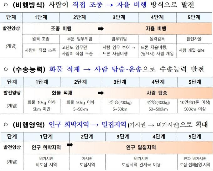 이번 로드맵은 드론 분야의 종합적·체계적 로드맵으로 가장 완화된 수준의 규제 개선이다. △ 비행방식 △ 수송능력 △ 비행영역 등 드론의 3대 기술 변수에 따른 발전 양상과 독일의 국제 드론연구기관인 '드론 인더스트리 인사이트'의 드론 비행기술 5단계를 종합해 단계별 시나리오를 도출했다.