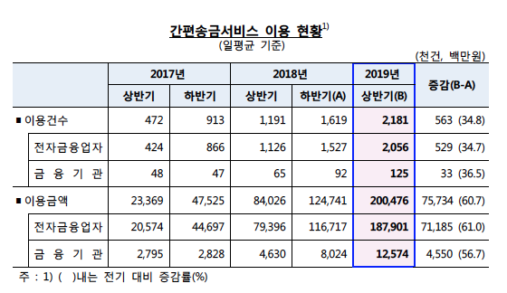 한국은행이 17일 발표한 2019년 상반기 중 전자지급서비스 이용 현황 자료에 따르면 올해 1~6월 간편송금 서비스 이용금액은 하루평균 2005억 원으로 작년 하반기보다 60.7% 증가했다. 이용 건수도 218만 건으로 34.8% 늘었다.