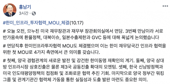 홍남기 부총리 겸 기획재정부 장관이 17일(현지시간) 미국 재무당국과 처음으로 인프라 협력 양해각서(MOU)를 체결했다며 이는 강건한 한미동맹을 재확인하는 계기가 됐다고 말했다.