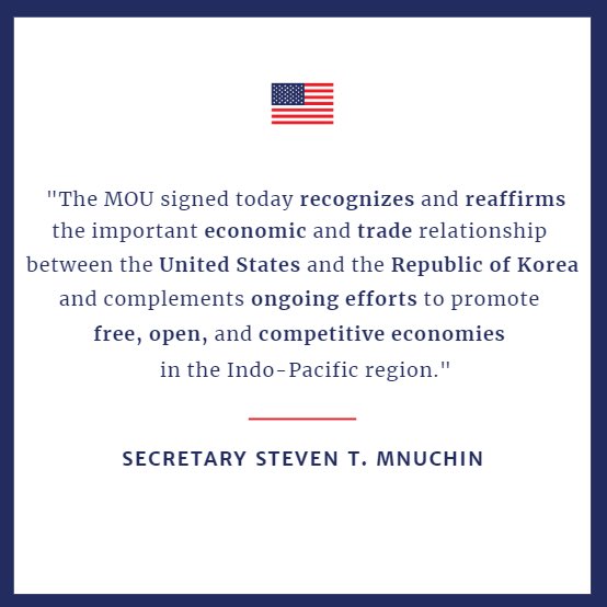므누신 미 재무장관은 "오늘 체결한 MOU는 미국과 한국의 중요한 경제 및 통상 관계를 인정하고 재확인하며 인도·태평양 지역의 자유롭고 개방적이며 경쟁력 있는 경제를 증진하기 위한 지속적인 노력을 보완한다"고 말했다.