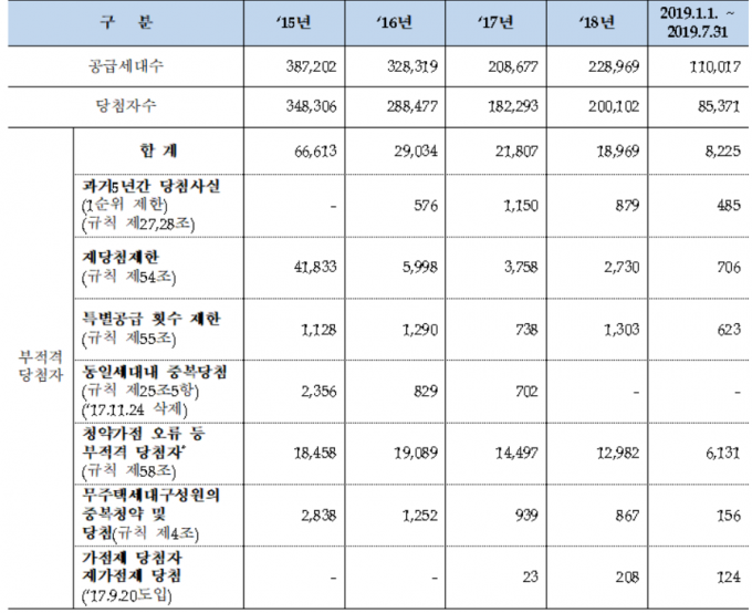 이중 청약가점 오류에 따른 부적격 당첨이 7만1157건으로 가장 많았다. 재당첨제한을 위반한 건수도 5만5022건에 달해 2위를 차지했다. 무주택세대구성원의 중복청약 및 당첨이나 특별공급 횟수 제한을 위반한 경우도 많았다.