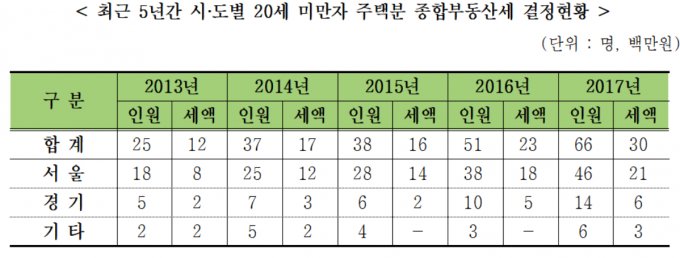 숫자는 매년 증가 추세다. 종부세를 납부한 만 20세 미만은 2013년 25명, 2014년 37명, 2015년 38명, 2016년 51명, 2017년 66명으로 5년 새 2.6배 증가했다.