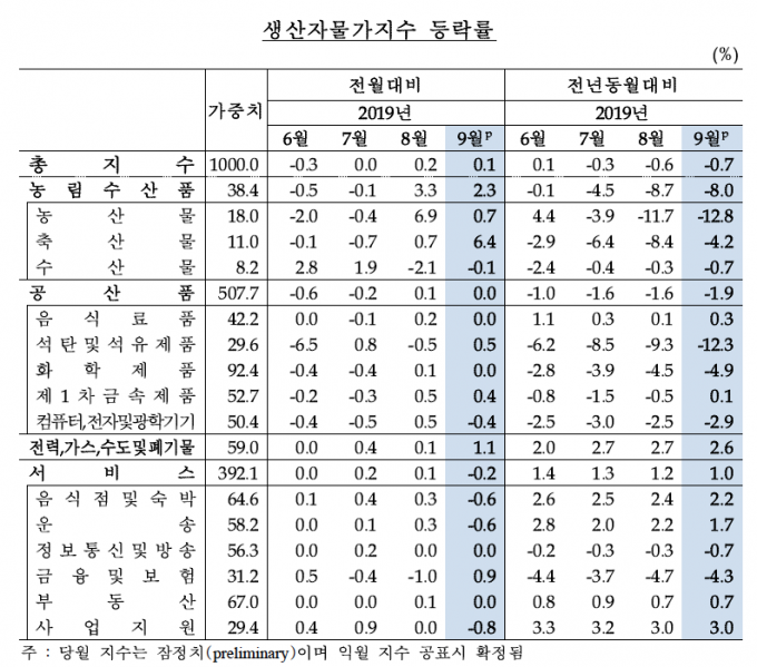 9월 생산자물가 작년대비 0.7%↓…석달 연속 마이너스