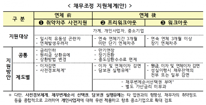취약 차주 사전지원은 연체가 우려되는 채무자, 프리워크아웃은 연체 기간 3개월 미만의 단기 채무자, 워크아웃은 연체 기간 3개월 이상의 장기 채무자가 그 대상이다.