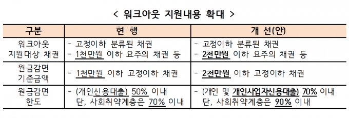 워크아웃을 활성화하기 위해 지원 대상을 확대하고 원금 감면 대상 채권과 한도도 확대한다.
