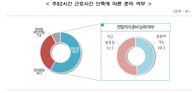 근로시간 단축을 준비 중인 기업 중에서 연말까지 준비를 완료할 수 있다고 응답한 곳은 48.3%, 시간이 불충분하다고 응답한 기업은 51.7%로 조사됐다.