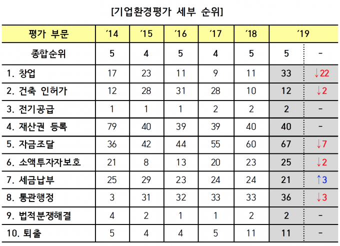 일 기획재정부에 따르면 2019년 세계은행의 기업환경평가(Doing Business 2020) 결과 한국이 평가대상 190개국 중 5위 기록했다.