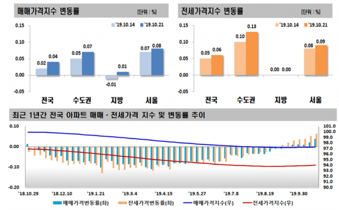 수도권은 0.07% 올랐다. 인천(0.02→0.07%), 경기(0.04→0.06%)도 일제히 상승폭이 확대됐다. 지방은 -0.01%에서 0.01%로 상승 전환했다. 2017년 8월 셋째 주 이후 약 2년 1개월 만이다.