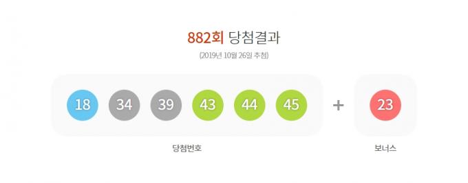 지난 26일 로또 수탁업체 동행복권은 복권통합포털을 통해 제882회 로또복권 당첨번호를 공개했다. 이날 발표된 1등 당첨번호는 18, 34, 39, 43, 44, 45며 2등 보너스번호는 23이다.