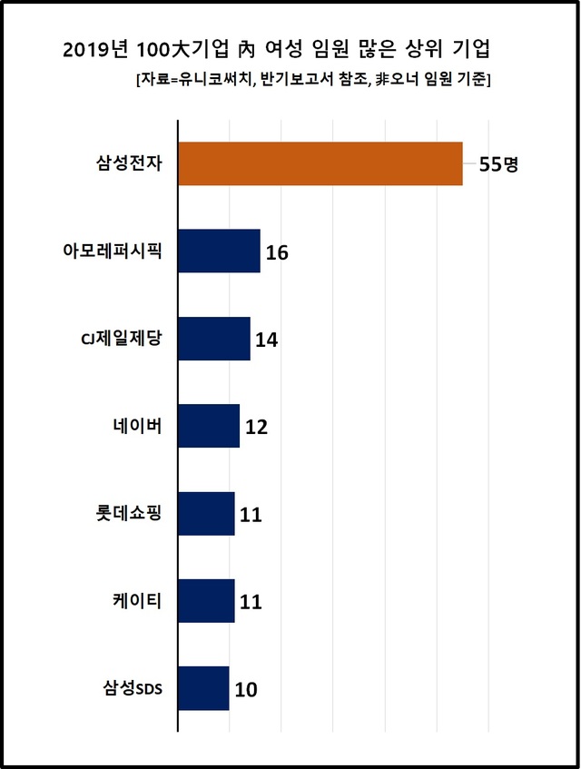 기업별로는 삼성전자가 여성 임원이 가장 많았다. 삼성전자는 여성 임원이 총 55명으로 전체 임원의 5.2%를 차지했다. 아모레퍼시픽(16), CJ제일제당(14), 네이버(12) ,롯데쇼핑·KT( 11), 삼성SDS(10명) 등이 그 뒤를 이었다.