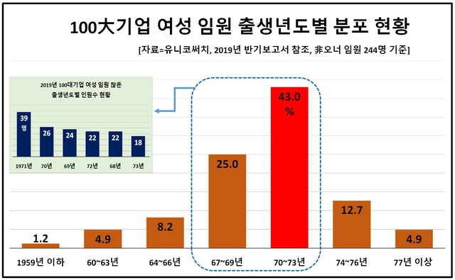 일 글로벌 헤드헌팅 전문업체 유니코써치(대표 김혜양)가 발표한 '2019년 국내 100대 기업 여성 임원 현황 조사'에 따르면 매출 기준 국내 100대 기업에서 오너가와 사외이사를 제외한 올해 여성 임원은 작년(216)보다 13% 증가한 244명으로 집계됐다.