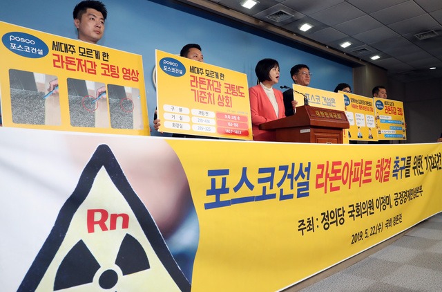 이에 이정미 정의당 의원은 "포스코건설은 라돈 관련 환경기준이 없다는 이유로 1급 발암물질인 라돈이 기준치 초과 검출됐음에도 대책마련에 쉬쉬하고 있다"며 "도의적 책임을 지고 시공사에서 건축자재 교체에 나서야 한다"고 주장했다. 아울러 이 의원은 라돈 건축자재 사용 금지와 라돈을 하자보수 대상에 포함하고, 담보 책임기간을 10년으로 확대하는 등 일명 '포스코건설 라돈방지법안'을 발의한 상태다.