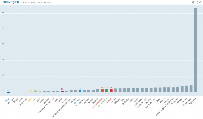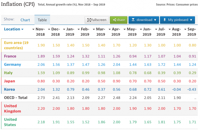 OECD 전체 평균은 2018년 11월 2.7%를 기록한 이후 올해 3월 2.3%로 떨어졌다. 미국은 같은 기간 동안 2.2%에서 1.9%로, 유로존은 1.9%에서 1.4%로, 일본은 0.8%에서 0.5%로 낮아지는 데 그쳤다.