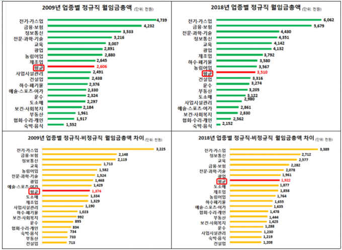 또한 비정규직 월임금총액이 최저임금 월환산액보다 적은 업종이 대폭 증가했다. 2009년 최저임금 월환산액(83.6만 원)보다 비정규직 월임금총액이 적은 업종은 숙박·음식업(81.8만 원) 1개였다.