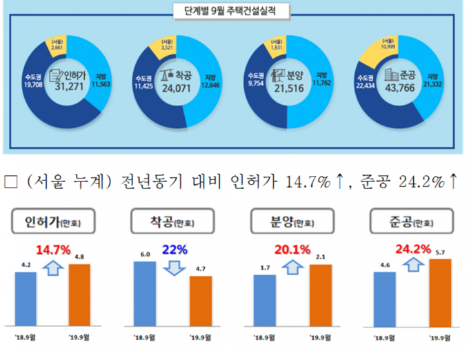 9월 주택 착공실적은 전국 2만4071가구로 전년 동월(3만1754가구) 대비 24.2% 줄었다. 1~9월 누계 착공실적의 경우 전년 동기 대비 수도권은 8.7%, 서울은 22% 감소했다.