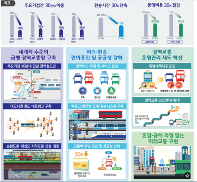 이번 구상안의 핵심은 광역거점 간 통행시간 30분대 단축, 통행비용 최대 30% 절감, 환승시간 30% 감소다. 이를 달성하기 위해 세계적 수준의 급행 광역교통망을 구축하고, 버스·트램 등 교통수단으로 편의를 증진하며, 선제적 운영관리 제도로 이행력을 강화한다는 방침이다.