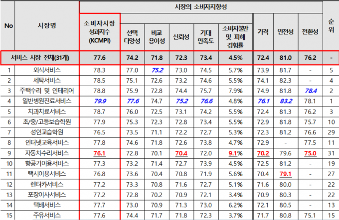 전체 서비스 시장 중 최저점을 기록한 것은 '자동차수리 서비스'였다. 자동차수리 서비스는 총점 76.1점을 받으며 2015년, 2017년에 이어 올해도 최하위를 기록했다.