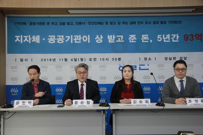 4일 경제정의실천시민연합(경실련)은 서울 종로구 경실련 강당에서 '지자체·공공기관, 언론사·민간단체에 돈 주고 상 받는 실태 전수조사 발표 기자회견'을 열고 이렇게 밝혔다.