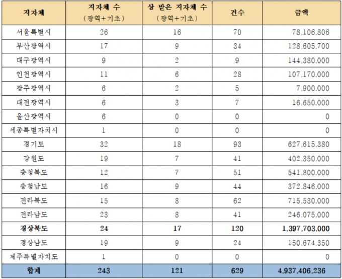 광역 지자체별로 수상 건수가 가장 많은 지역은 경상북도였다. 경북 내 지자체 24곳 중 17곳이 120차례 상을 받고 14억 원가량의 금액을 지출했다. 이어 전북(7억여 원), 경기(6억여 원) , 충북(5억여 원), 강원(4억여 원)순이었다. 울산·세종·제주는 돈을 지출하는 상을 받지 않은 것으로 조사됐다.