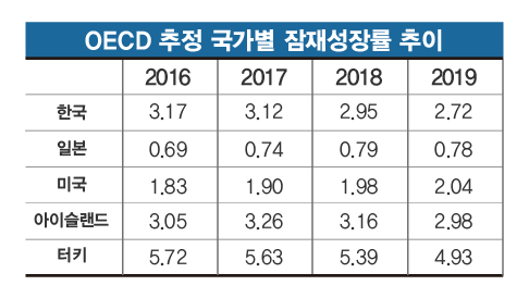 경제협력개발기구(OECD) 통계에 따르면 한국의 올해 잠재성장률은 2.72%로 집계됐다. 2017년 3.12%였던 잠재성장률이 2년 새 0.40%포인트 떨어진 것이다. 속도가 지나치게 빠르다.