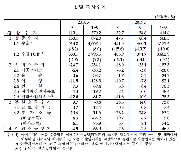 수출은 460억1000만 달러로 작년 9월 대비 10.3% 줄어 10개월 연속 감소세를 이어갔다. 한은은 세계제조업 및 교역이 위축되는 가운데 반도체 및 석유류 단가 하락세와 대중국 수출 부진이 지속한 데 따른 것이라고 설명했다. 상품 수입은 371억7000만 달러로 전년 동월 대비 3% 감소하면서 5개월 연속 하락세를 기록했다.