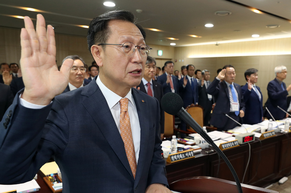 ▲ 김종갑 한국전력공사 사장이 지난달 11일 전남 나주시 한전 본사에서 열린 2019년도 국회 산업통상자원 중소벤처기업위원회의 국정감사에 출석, 증인 선서를 하고 있다. [뉴시스]