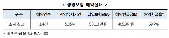 해약자는 평균 5813000원을 납입했다가 해약 후 평균 4059000원을 돌려받아 해약환급률은 평균 69.7%로 집계됐다.