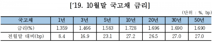 8일 금융투자협회가 발표한 '10월 장외채권시장 동향'에 따르면 지난 10월 말 기준 3년 만기 국고채 금리는 전월 말 대비 16.9bp(1bp=0.01%p) 상승한 연 1.466%를 기록했다.