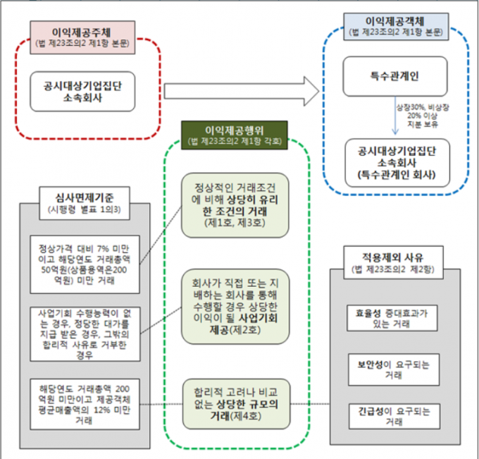 우선 부당한 이익 제공 행위에서 주체와 객체를 명확히 했다. 부당한 이익을 제공하는 주체는 '공시 대상 기업 집단 소속 회사', 이를 받는 객체는 '특수관계인 회사'다. 이때 특수관계인 회사란 '동일인 및 친족이 30%(상장사 기준·비상장사는 20%) 이상 지분을 보유한 기업'이다.