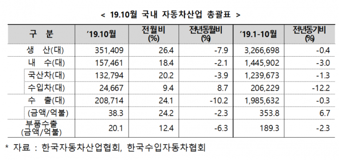 산업통상자원부가 14일 발표한 '10월 국내 자동차 산업 동향'에 따르면, 생산은 전년 동월 대비 7.9% 감소한 35만1409대, 수출은 10.2% 감소한 20만8714대, 내수는 2.1% 감소한 15만7461를 각각 기록했다.
