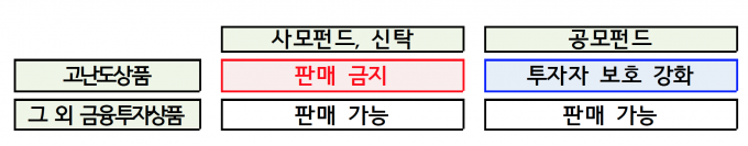 금융당국은 고난도 사모펀드의 은행 판매를 제한할 방침이다. 은행은 상대적으로 투자자 보호 장치가 잘 갖춰진 공모펀드 중심 판매채널로 전환될 예정이다. 은행 고객의 고난도 사모펀드 등에 대한 접근성은 사모투자재간접펀드(사모펀드에 50% 이상 투자하는 공모펀드)로 보완할 계획이다.