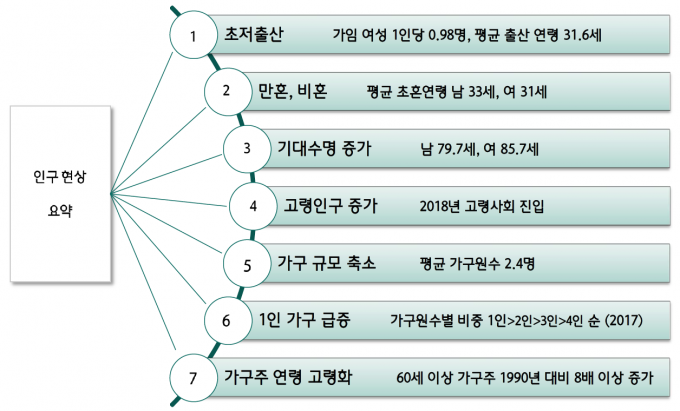 지난해 기준 65세 이상의 고령인구 비중은 14.3%로, 유소년 인구 비중(12.8%)을 넘어섰다. 합계 출산율은 0.98명을 기록했고, 평균 초혼 연령은 남성 33세, 여성 31세로 높아졌다.