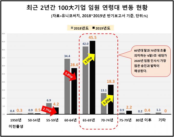 실제로 2018년과 2019년 100대 기업 임원 연령대 변동 추이를 살펴보면 50년대 말과 60년대 초반 사이는 출생자는 8%가량 줄어든 반면, 60년대 말과 70년대 초는 8% 정도 증가한 것으로 조사됐다.