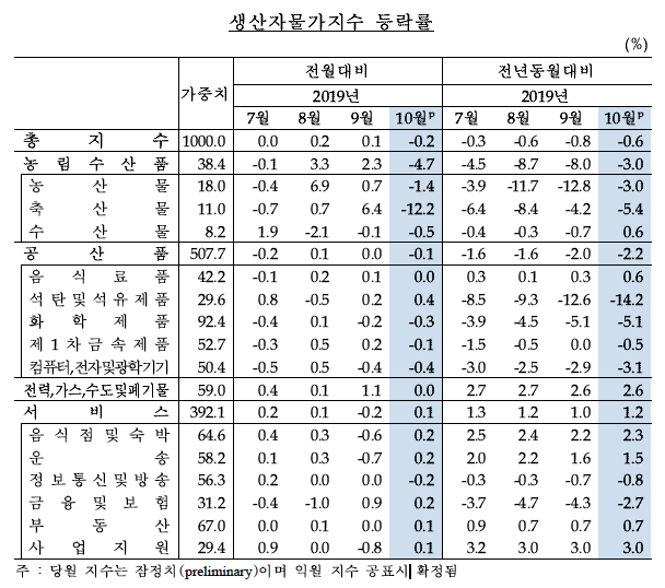 돼지고기 값이 내린 것이 10월 생산자물가지수 하락을 이끌었다. 아프리카돼지열병(ASF)에 따른 공급 증가와 수요 감소로 돼지고기 가격이 32.5% 급락했다. 이 여파로 축산물가격이 전월 대비 12.2% 폭락했다.