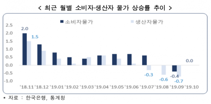 특히, 1965년부터 올해 10월까지 소비자물가 상승률이 마이너스를 기록한 것은 지난 9월(-0.4%)이 사상 처음이다. OECD 34개국 중에서도 최저치다.