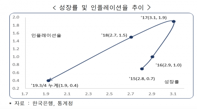 한경연은 2015년 이후 성장률과 인플레이션율 관계를 살펴보면 최근 저성장·저물가 현상이 심해지고 있다는 점이 드러난다고 지적했다.