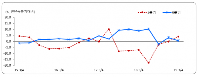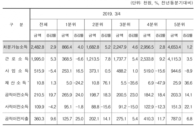 반면 상위 20%인 5분위의 사업소득은 154만1000원으로 전년 같은 기간보다 12.6% 감소했다. 4분위 역시 같은 기간 사업소득이 10%나 줄었다. 중간 수준인 소득 3분위에선 지난해와 비슷한 수준이었다.