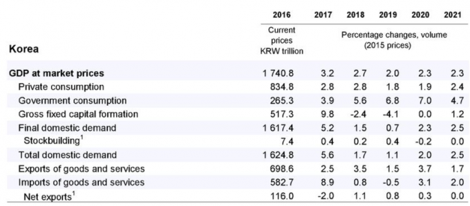 민간소비도 2.5%에서 1.8%로 증가 폭이 둔화할 것으로 전망됐다. OECD는 "글로벌 경기 둔화, 반도체 가격 하락 등으로 수출과 투자가 둔화하고 있다"면서 "주택투자도 주택 공급의 순환주기상 둔화 등에 의해 위축되고 있다"고 분석했다.
