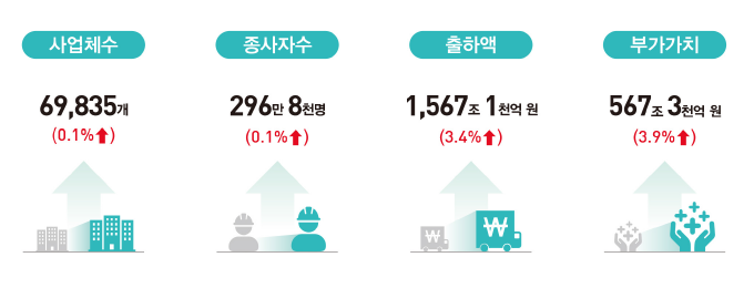 사업체 수(6만9835개)와 종사자 수(296만8000명)는 전년보다 각각 0.1%(45개), 0.1%(2000명) 증가했다. 이는 최근 10년간 연평균 증가율(각각 1.7%, 1.9%)을 하회한다.