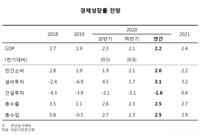 자본시장연구원은 28일 발표한 '2020년 경제 및 자본시장 전망'을 통해 내년 우리 경제가 수출과 설비투자 회복에도 불구하고 소비 회복 지연 및 건설투자 부진이 지속하면서 2.2%의 성장률을 나타낼 것이라고 전망했다.